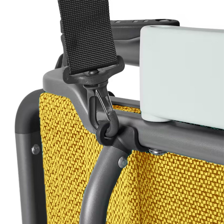 सुलभ वाहतुकीसाठी खांद्याच्या पट्ट्यासह टिकाऊ, हलक्या वजनाच्या कॅरी बॅगचा समावेश आहे. दुमडल्यावर, खुर्ची एक सडपातळ प्रोफाइल ठेवते जी कारच्या ट्रंक आणि स्टोरेज कंपार्टमेंटमध्ये उत्तम प्रकारे बसते.