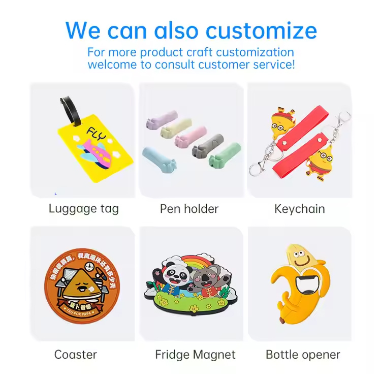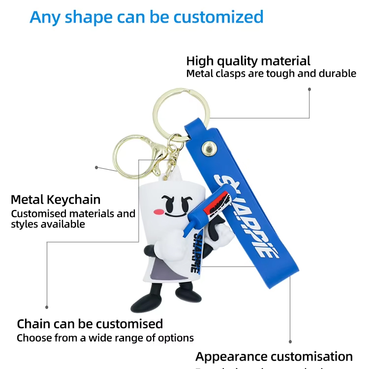 तुमचा ब्रँड किंवा कल्पना पूर्णपणे सानुकूलित 2D किंवा 3D डिझाइनसह जिवंत करा. लोगो, शुभंकर किंवा घोषवाक्य असो, आमची सॉफ्ट PVC कीचेन तुमच्या दृष्टीला दोलायमान रंग आणि उच्च तपशिलांसह जुळण्यासाठी तयार केलेली आहे.
