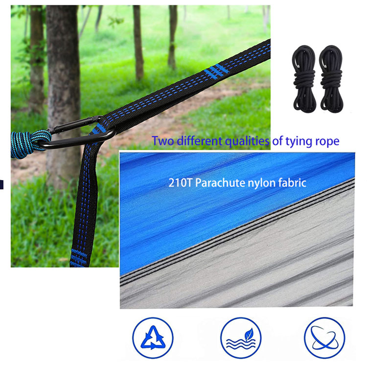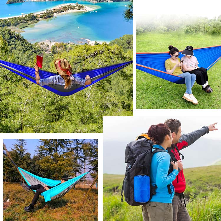 कॅम्पिंग हॅमॉक पोर्टेबल हॅमॉक आउटडोअर इनडोअर सिंगल. इनडोअर आणि आउटडोअर विश्रांतीसाठी तुमचा अंतिम पोर्टेबल रिट्रीट. हा अष्टपैलू हॅमॉक एकल साहसांसाठी किंवा दोन लोकांसाठी आरामदायक क्षणांसाठी कुशलतेने डिझाइन केलेले आहे. त्याची हलकी, पॅक करण्यायोग्य रचना कोणत्याही कॅम्पिंग ट्रिप किंवा बॅकयार्ड गेटवेसाठी एक आवश्यक साथीदार बनवते.