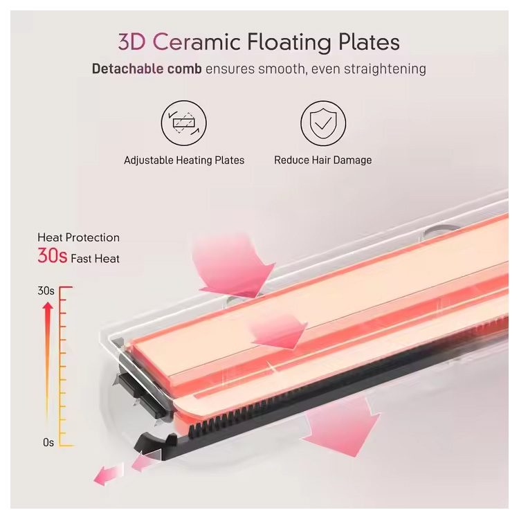 हे स्ट्रेटनर केसांच्या शाफ्टमध्ये हळूवारपणे प्रवेश करण्यासाठी, केस आतून बाहेरून गरम करण्यासाठी इन्फ्रारेड उष्णता वापरते. हे ओलावा लॉक करताना पृष्ठभागाचे नुकसान कमी करते, परिणामी केस सुधारित ताकद आणि लवचिकतेसह गुळगुळीत, चमकदार बनतात.