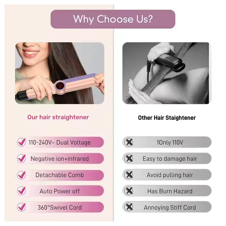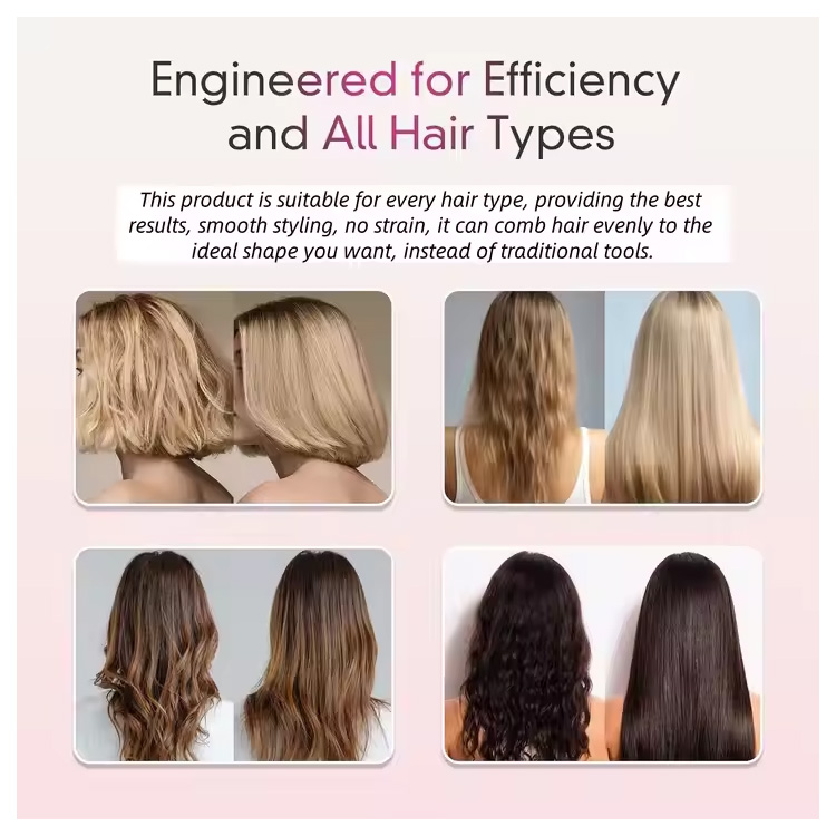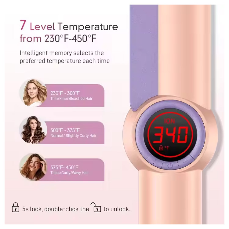 बारीक, मध्यम किंवा खडबडीत केसांसाठी सानुकूल करण्यायोग्य उष्णता सेटिंग्ज वैशिष्ट्ये. तुम्ही सरळ करत असाल, कर्लिंग करत असाल किंवा हलवत असाल तरीही, तुम्ही उष्णतेच्या नुकसानीचा धोका न घेता कार्यक्षमतेने स्टाइल करण्यासाठी आदर्श तापमान निवडू शकता.