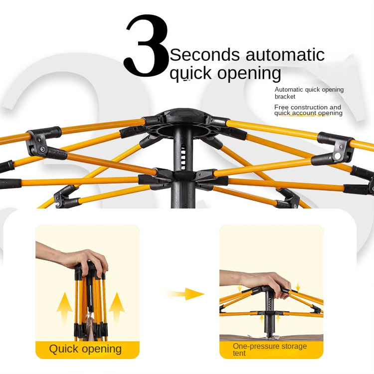 उच्च-गुणवत्तेचा 2, 4, 6-व्यक्ती वॉटरप्रूफ ऑटोमॅटिक आउटडोअर टेंट. आमच्या उच्च-गुणवत्तेच्या ऑटोमॅटिक टेंटसह सहज कॅम्पिंगचा अनुभव घ्या. 2, 4 किंवा 6 लोकांसाठी डिझाइन केलेले, यात उत्कृष्ट जलरोधक आणि पवनरोधक संरक्षणासाठी सुपीरियर डबल जाड ऑक्सफर्ड फॅब्रिक आहे. सर्व हवामानातील मैदानी साहसांसाठी तुमचा विश्वसनीय निवारा.