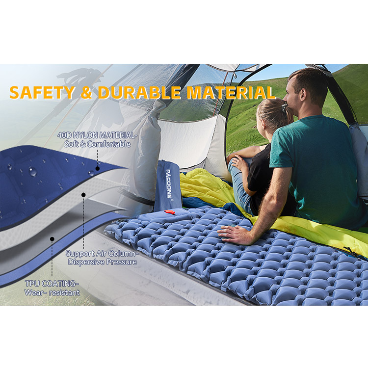 लाइटवेट नायलॉन मटेरियल फोल्डिंग कॅम्पिंग टेंट स्लीपिंग पॅड. बाहेरच्या साहसांसाठी तुमचे अल्टिमेट पोर्टेबल स्लीप सोल्यूशन. या अल्ट्रालाइट इन्फ्लेटेबल मॅट्रेसमध्ये सिंगल-प्रेस इन्फ्लेशन आणि इंटिग्रेटेड पिलो डिझाइनची वैशिष्ट्ये आहेत. टिकाऊ नायलॉन सामग्रीपासून तयार केलेले, हे हायकिंग आणि कॅम्पिंगसाठी उत्कृष्ट आराम देते, कोठेही आरामदायी रात्रीची खात्री देते.