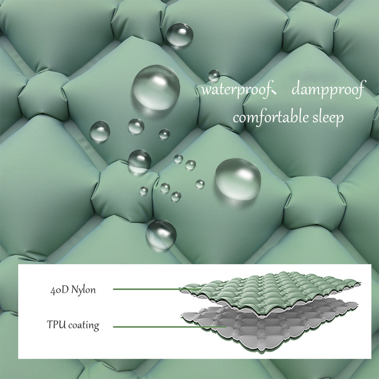 TPU लॅमिनेशनसह 30D रिपस्टॉप नायलॉनपासून बनविलेले, अपवादात्मक अश्रू प्रतिरोधक आणि विविध बाह्य परिस्थितींमध्ये रात्रभर विश्वसनीय हवा टिकवून ठेवण्याची ऑफर देते.