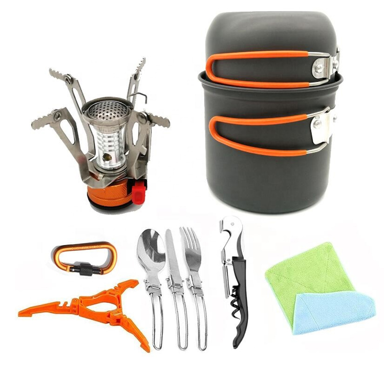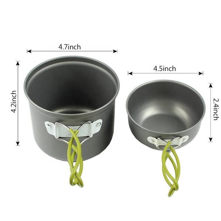 आउटडोअर पोर्टेबल कॅम्पिंग हायकिंग बॅकपॅकिंग कुकवेअर सेट. मैदानी साहसांसाठी तुमचे अंतिम कॉम्पॅक्ट कुकिंग सोल्यूशन. हा हॉट प्रॉडक्ट कुकवेअर सेट 1-2 व्यक्ती कॅम्पिंग आणि हायकिंग ट्रिपसाठी डिझाइन केला आहे. बॅकपॅकिंग आणि आपत्कालीन तयारीसाठी योग्य, हे जास्तीत जास्त पोर्टेबिलिटीसह आवश्यक स्वयंपाक साधने एकत्र करते.