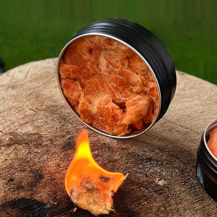 विशेषत: जलरोधक मेण आणि खनिज-आधारित फायर मडसह तयार केलेले, हे टिंडर पाऊस, बर्फ किंवा उच्च आर्द्रतेच्या संपर्कात असताना देखील जलद प्रज्वलन प्राप्त करते, ज्यामुळे टिकून राहण्याच्या गंभीर परिस्थितीत विश्वसनीय आग सुरू होते.